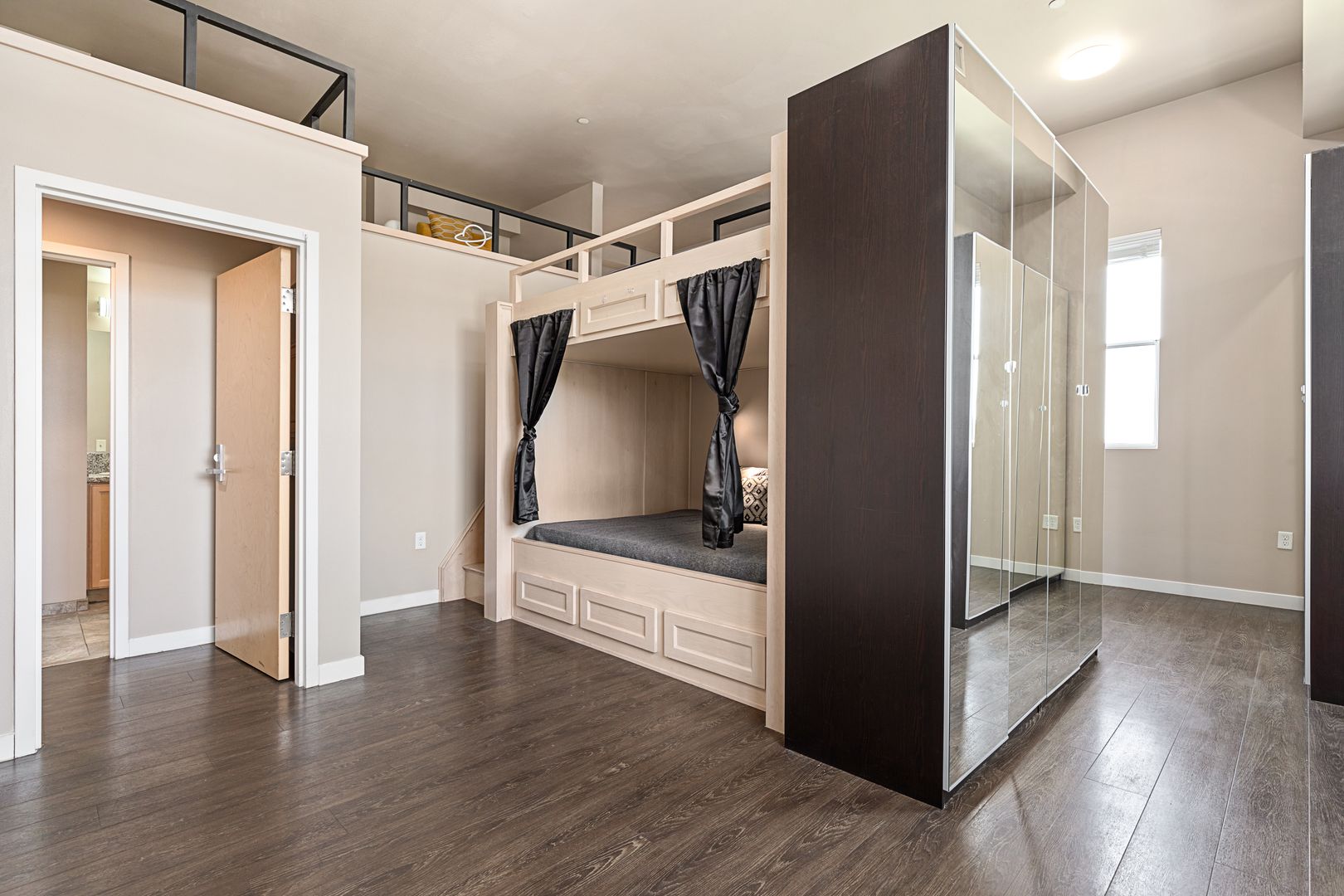 • Includes a queen-size bed, loft setup, regular closet, wood flooring, and AC