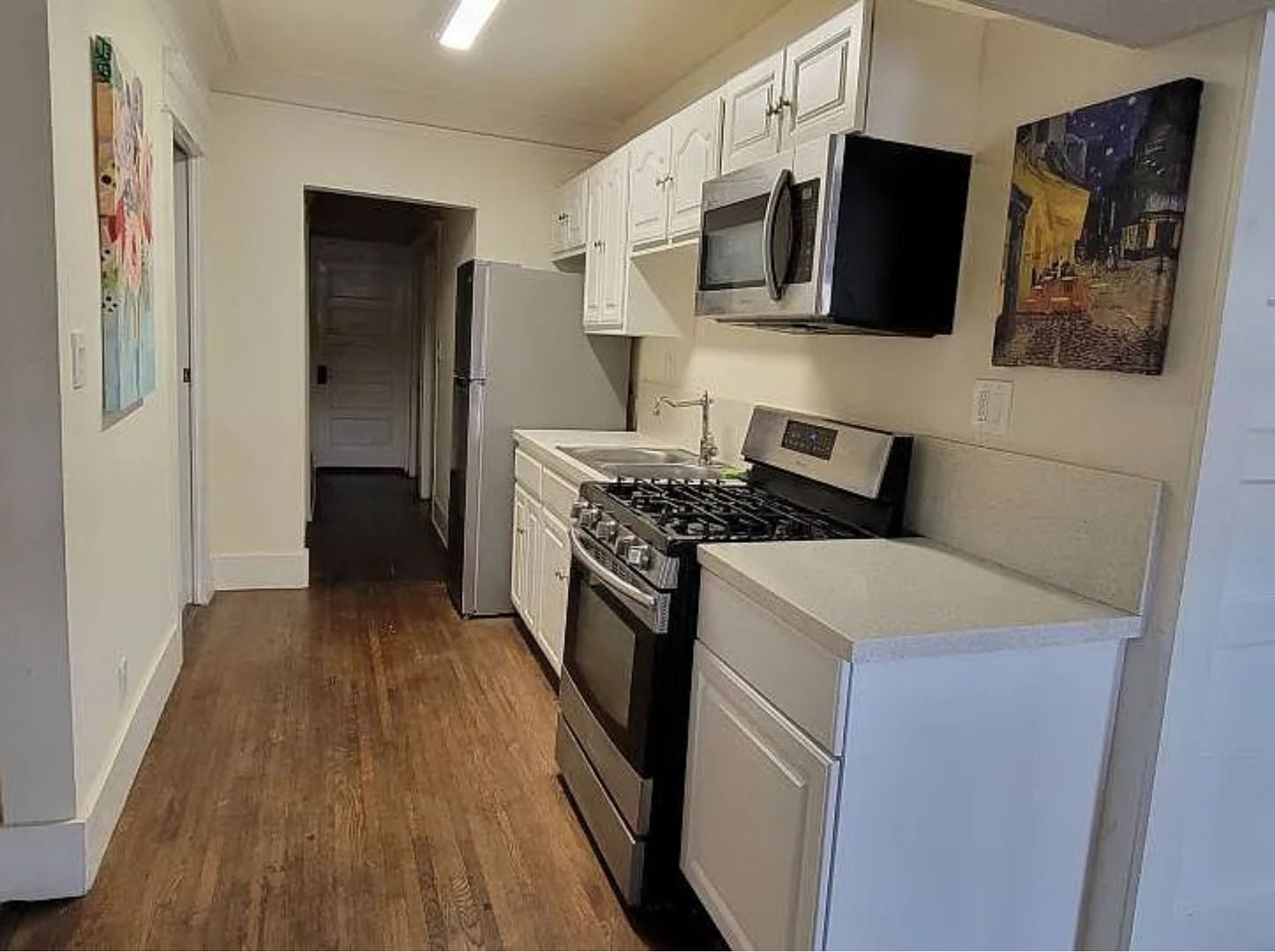 • The apartments at 1431 W 24th St feature spacious rooms, wood floors, tile floors, and quartz countertops in the kitchen and bathroom spaces.