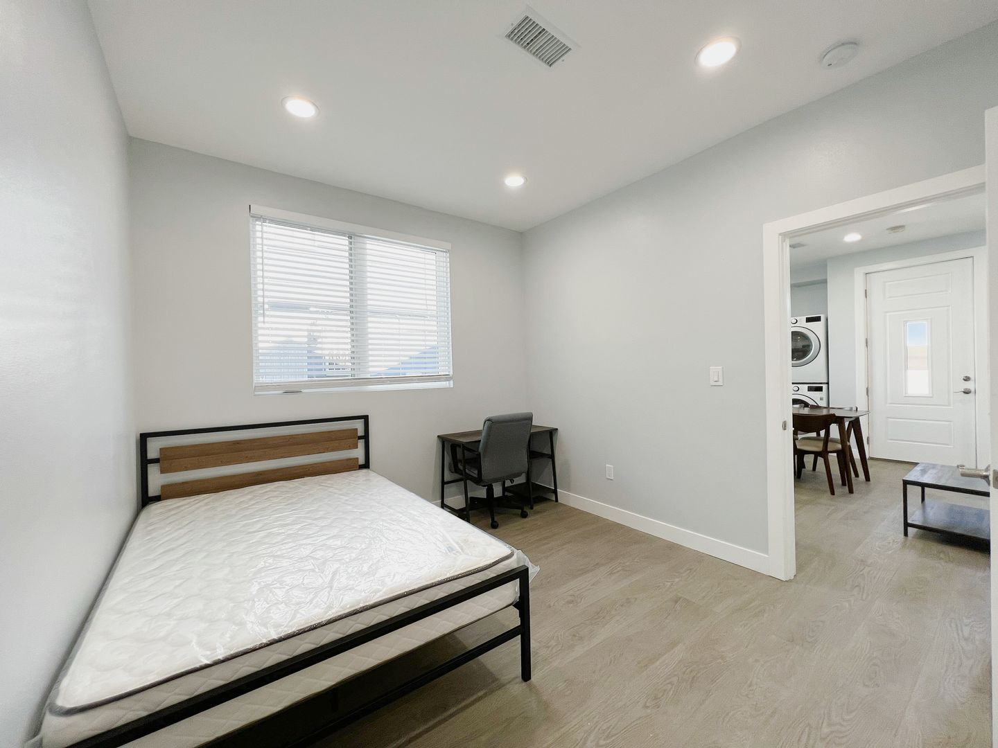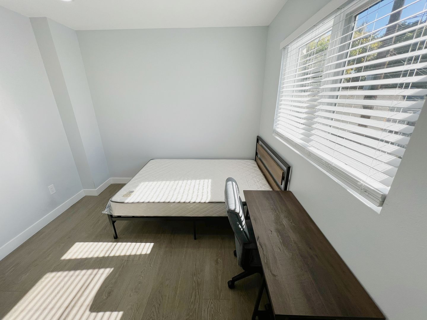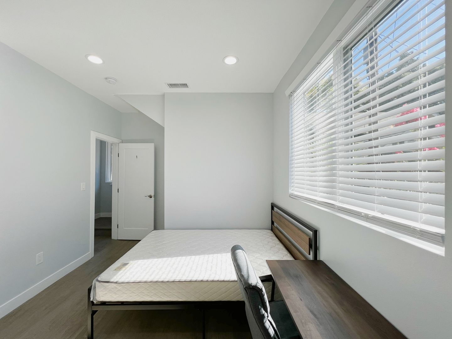 • Each bedroom is furnished with a bed, desk, and chair.