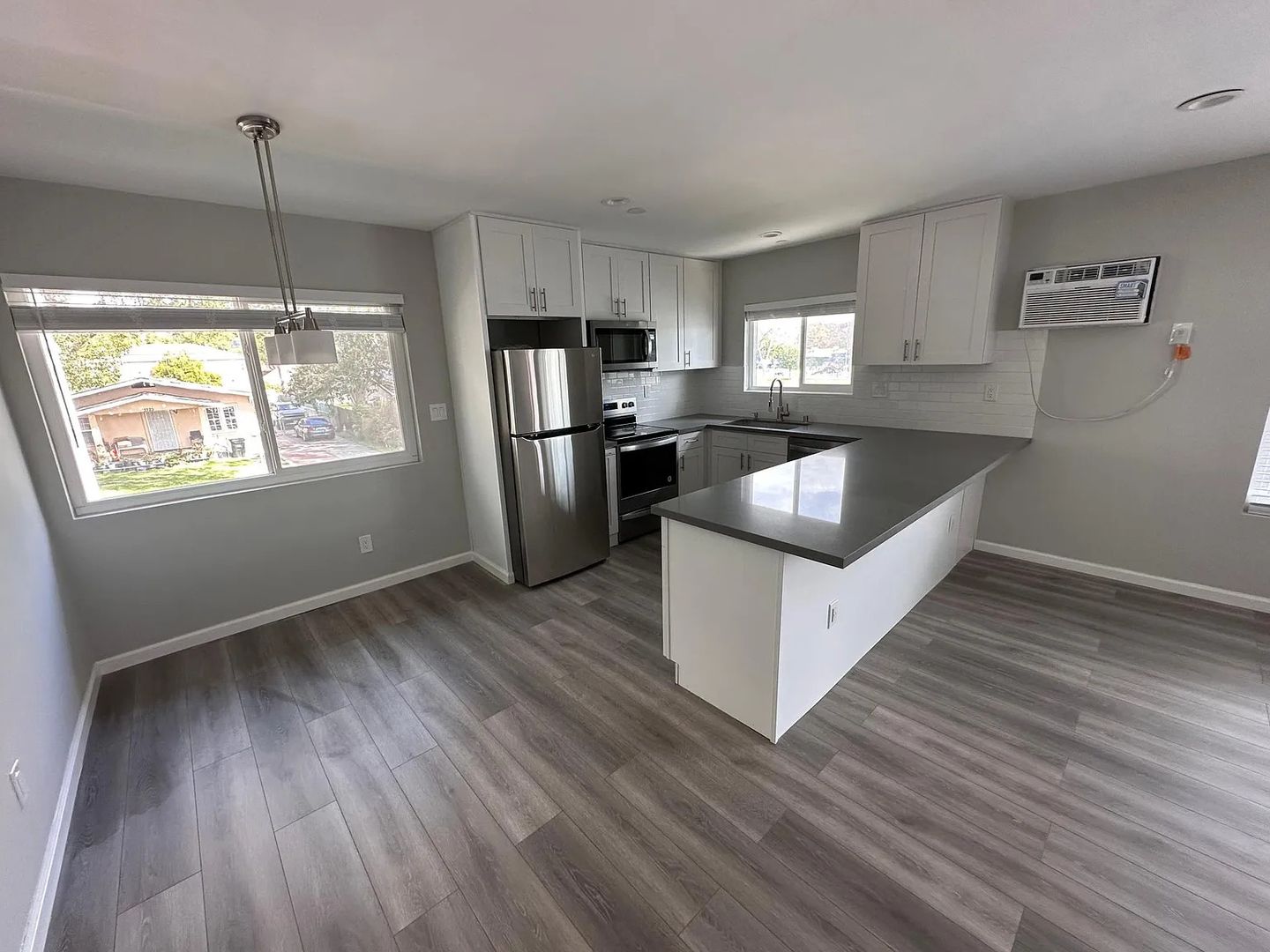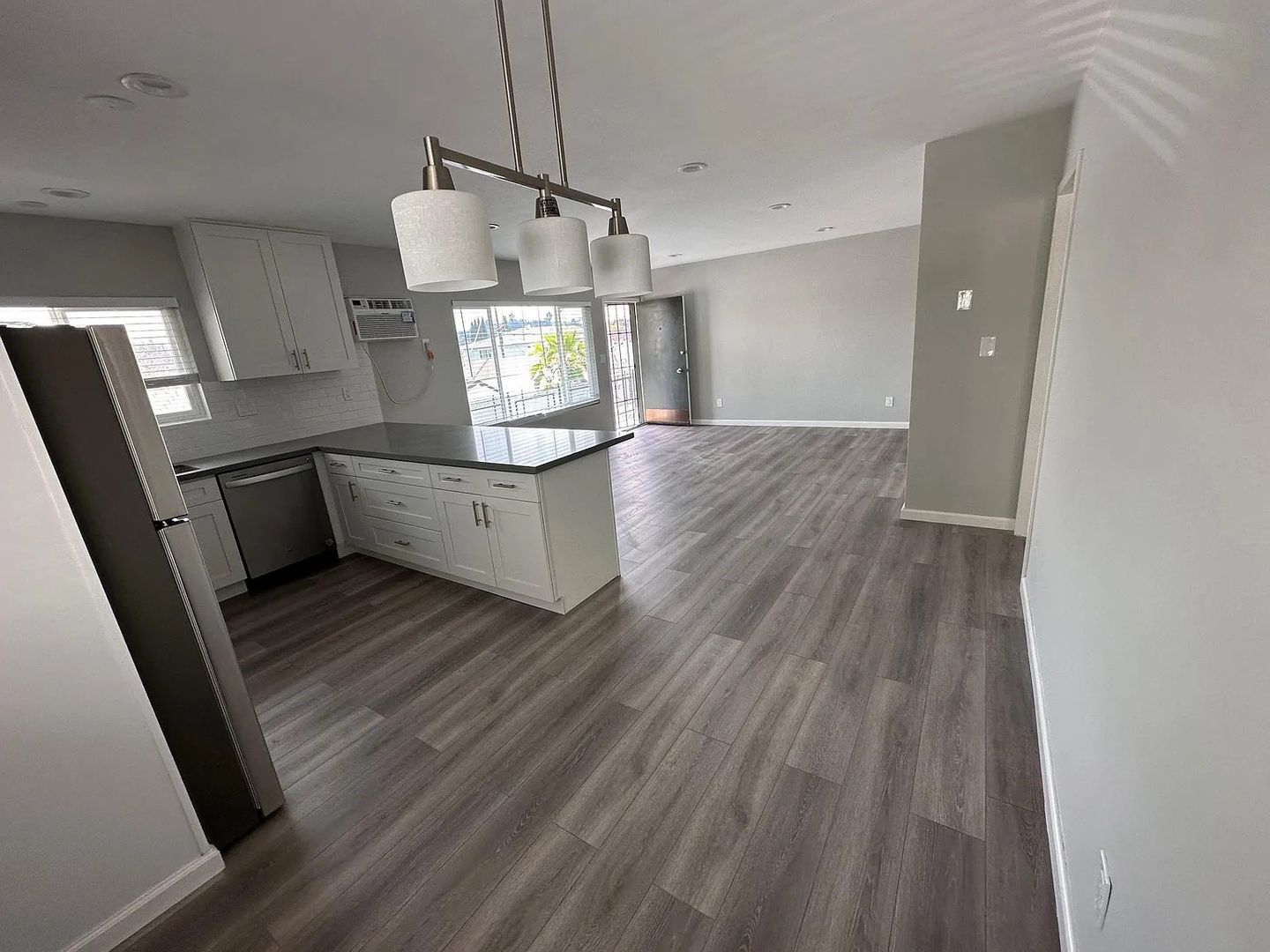 This beautifully remodeled one-bedroom apartment features spacious rooms with elegant wood and tile floors, individual air conditioning and heating in both the bedroom and living room for year-round comfort, a private bathroom, and convenient onsite laundry facilities.