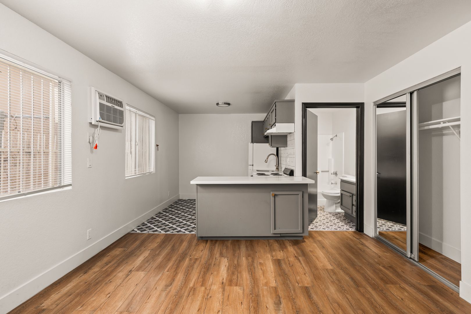 • Equipped with mini blinds, wood floors, tile floors, quartz/granite countertops, shared laundry, and AC.