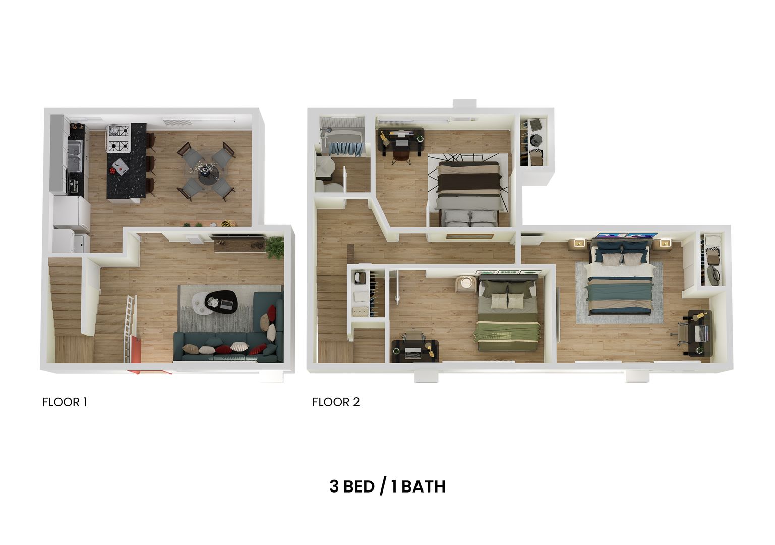 • Our charming three-bedroom townhome feature high wooden ceilings, large kitchens with stove and refrigerator, air conditioning, and washer & dryer.