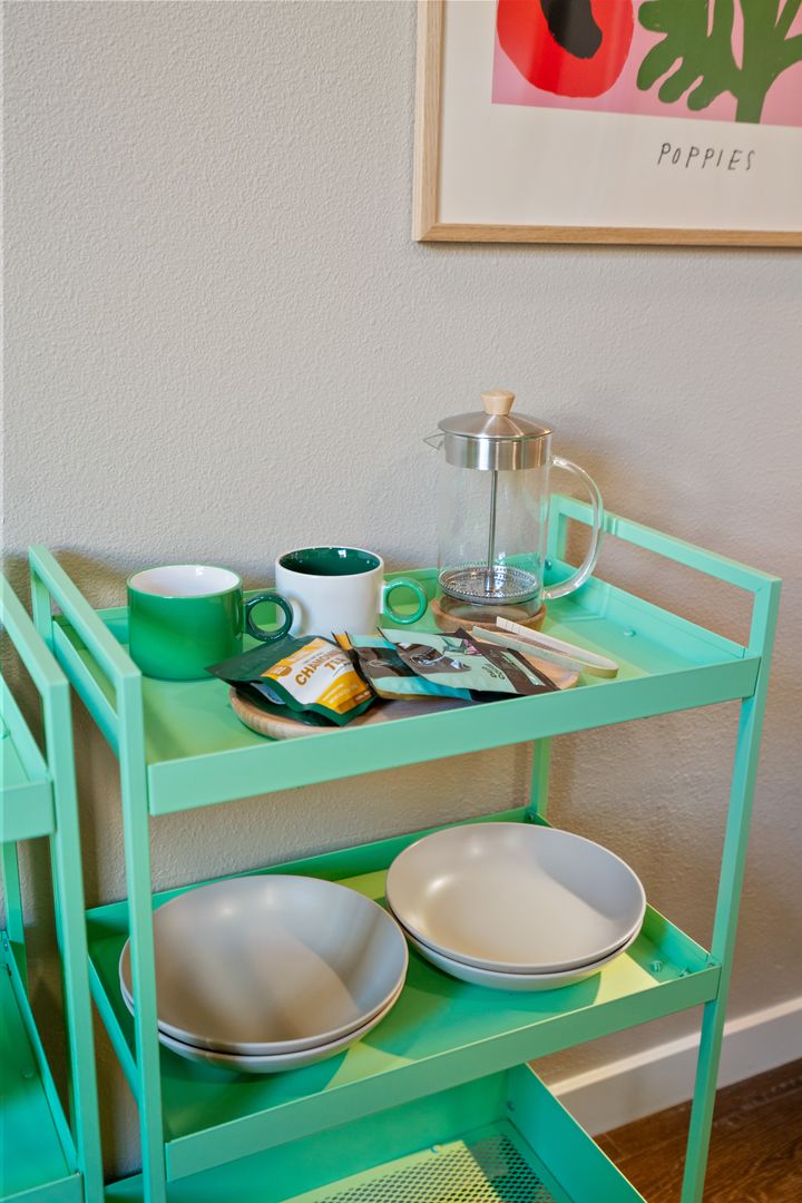 • Modern, fully furnished units with granite countertops, stainless-steel appliances, and in-unit laundry.