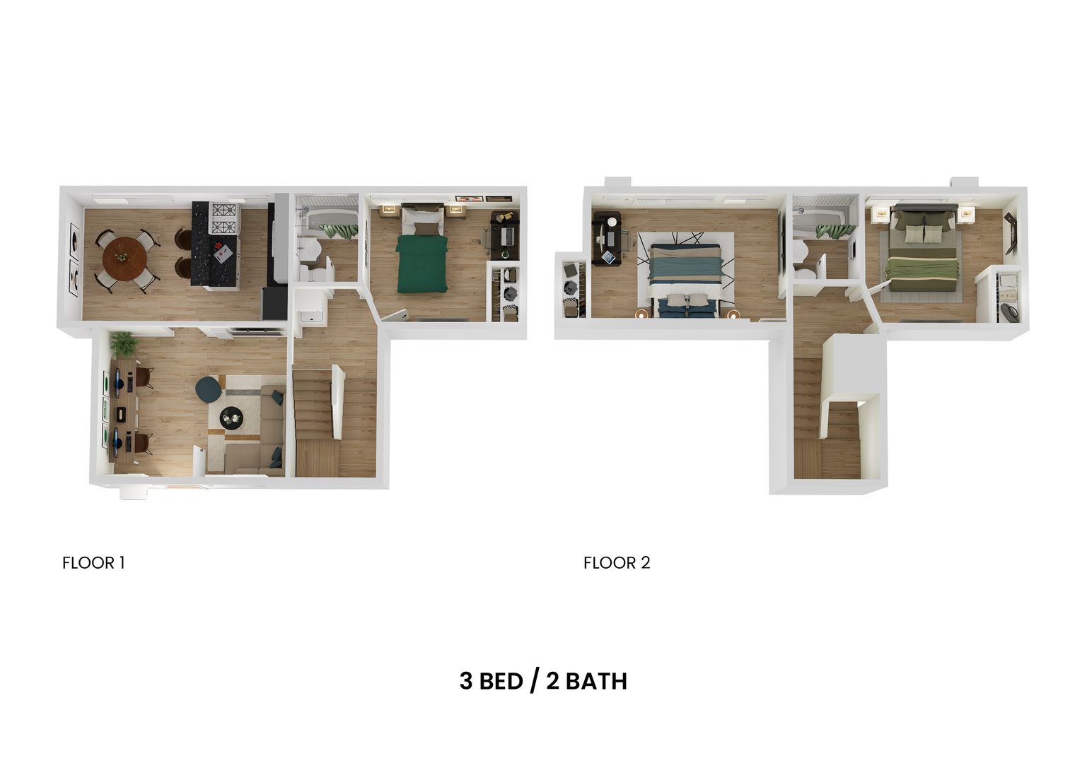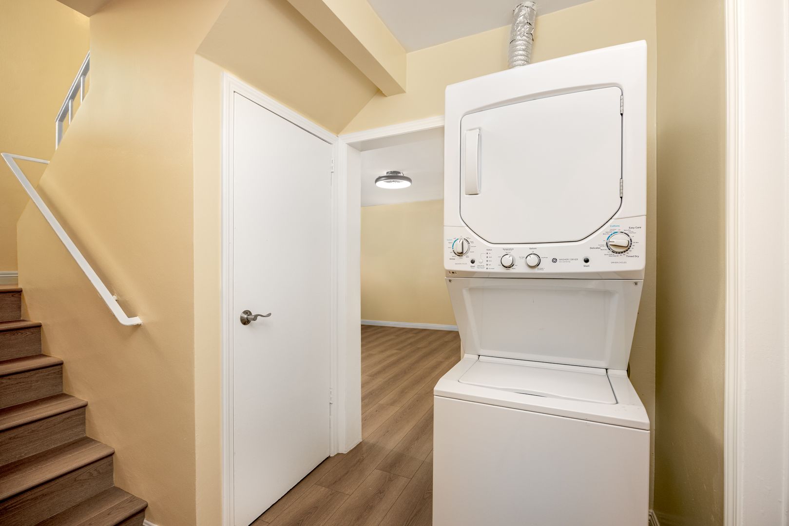 • Our charming three-bedroom townhomes feature high wooden ceilings, large kitchens with stove and refrigerator, air conditioning, and washer & dryer.