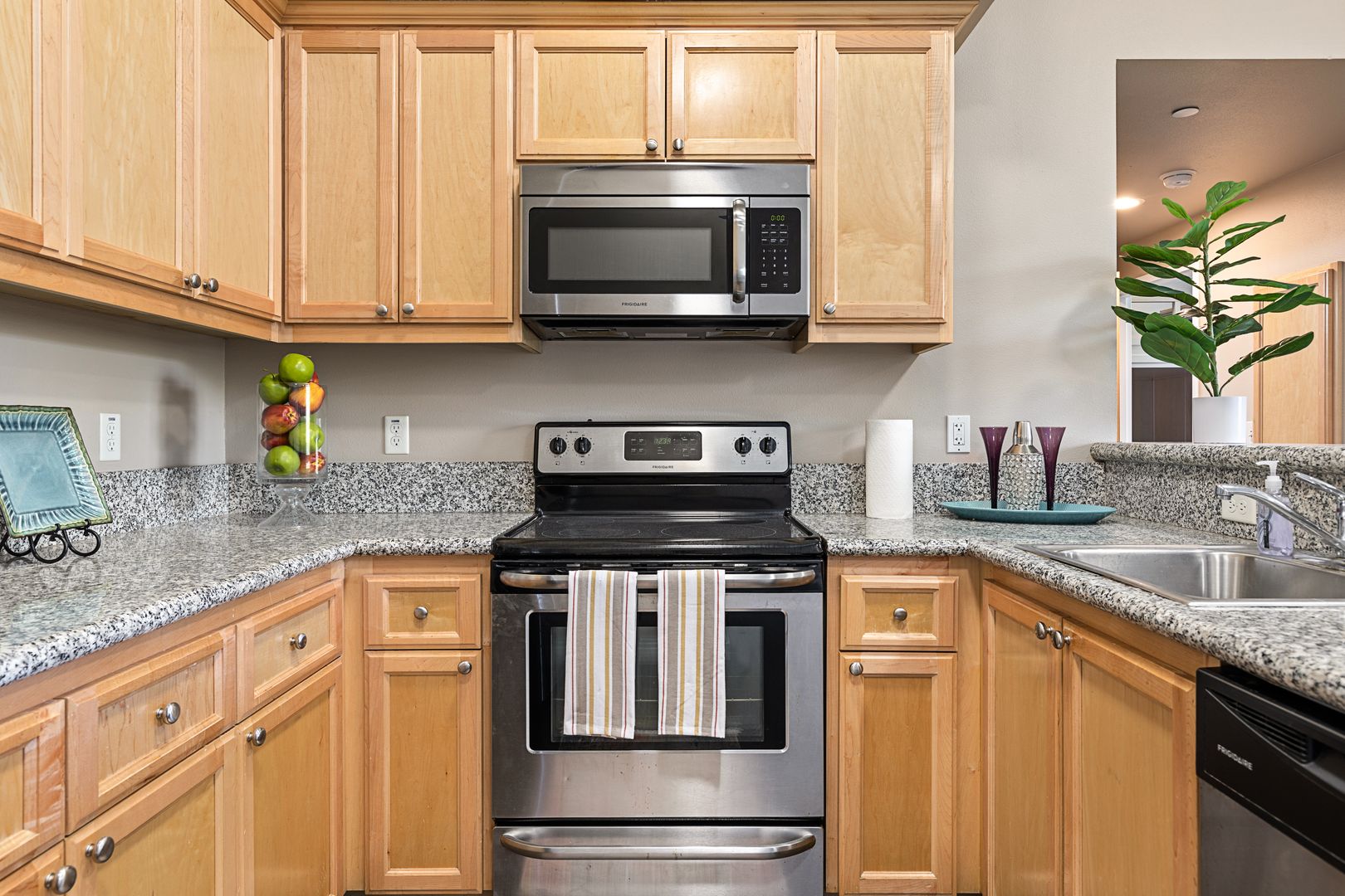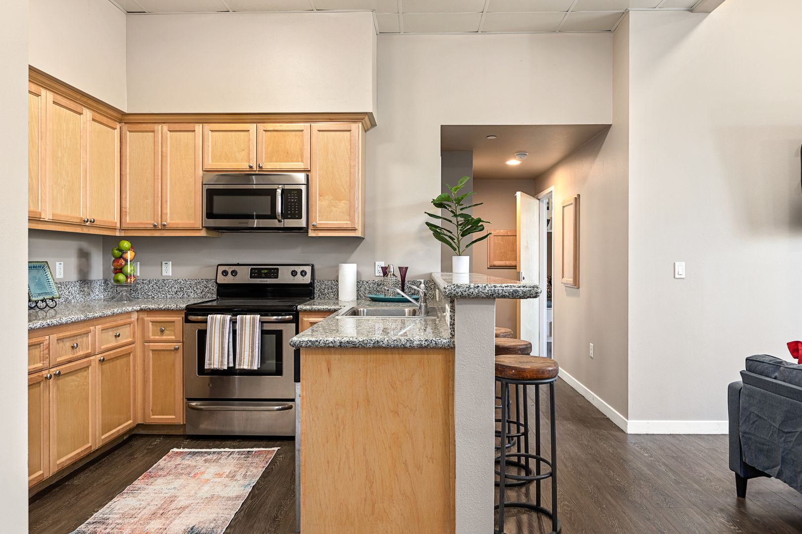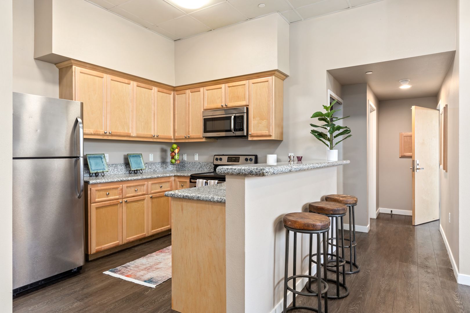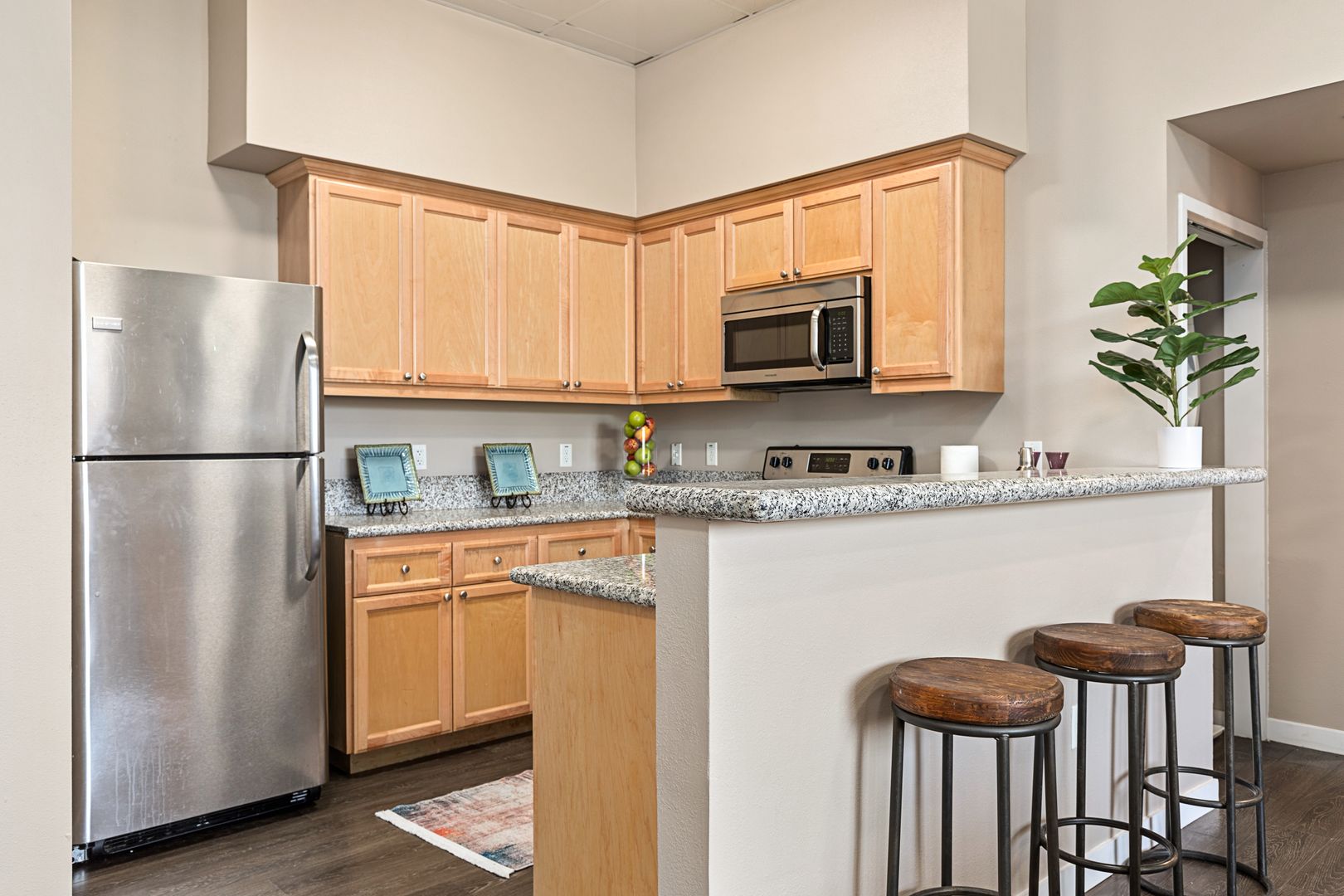 • The apartments at The Row House - USC feature modern styling, including fully equipped kitchens with granite countertops and stainless-steel appliances.