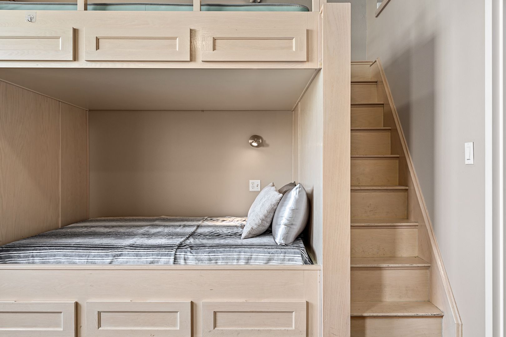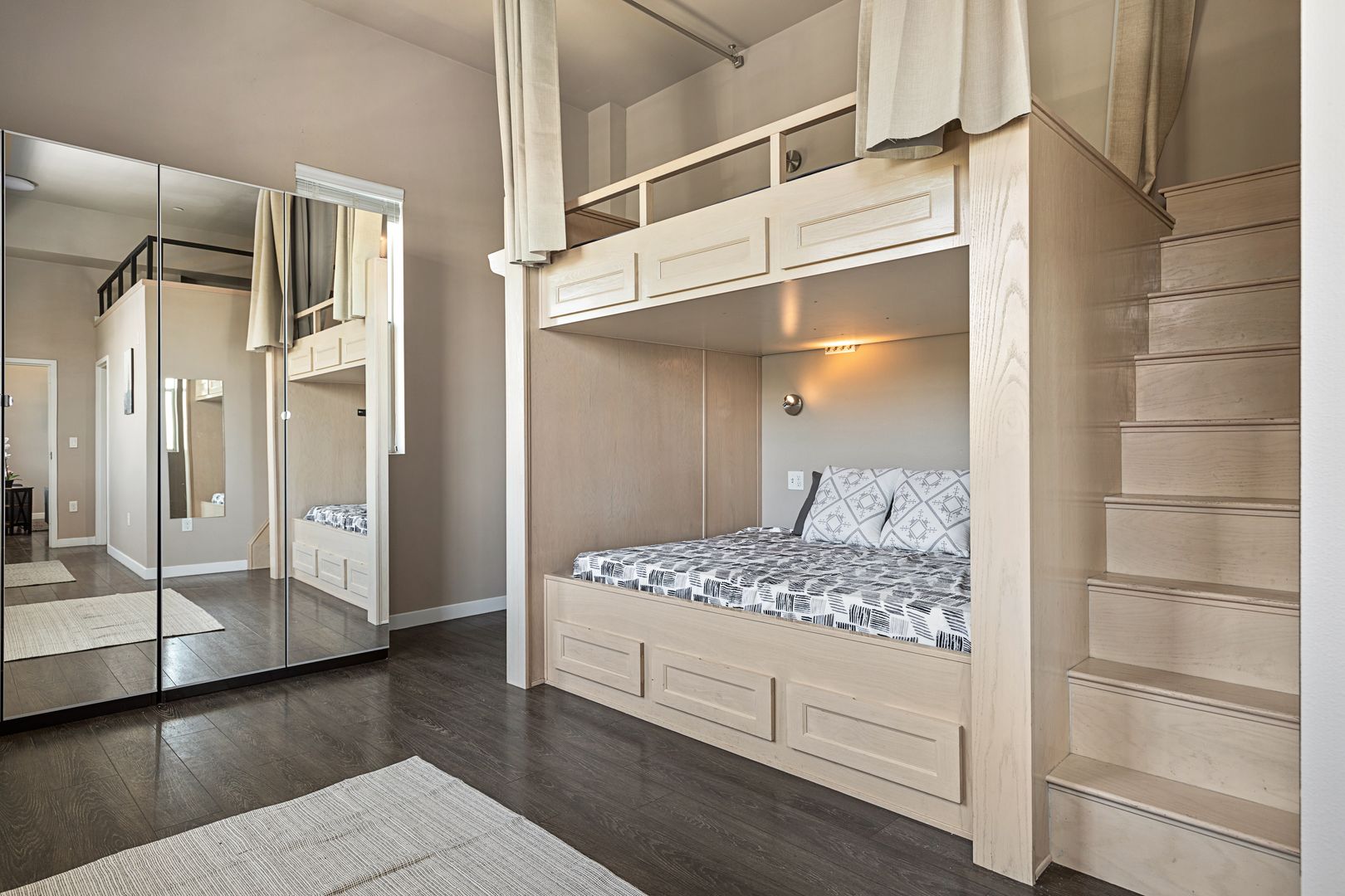 • The interiors boast vaulted ceilings, air conditioning, in-unit full-size washer and dryer, and in-unit laundry. The living rooms and bedrooms are spacious and furnished with custom-built queen-size beds and lofts, and hardwood flooring.
