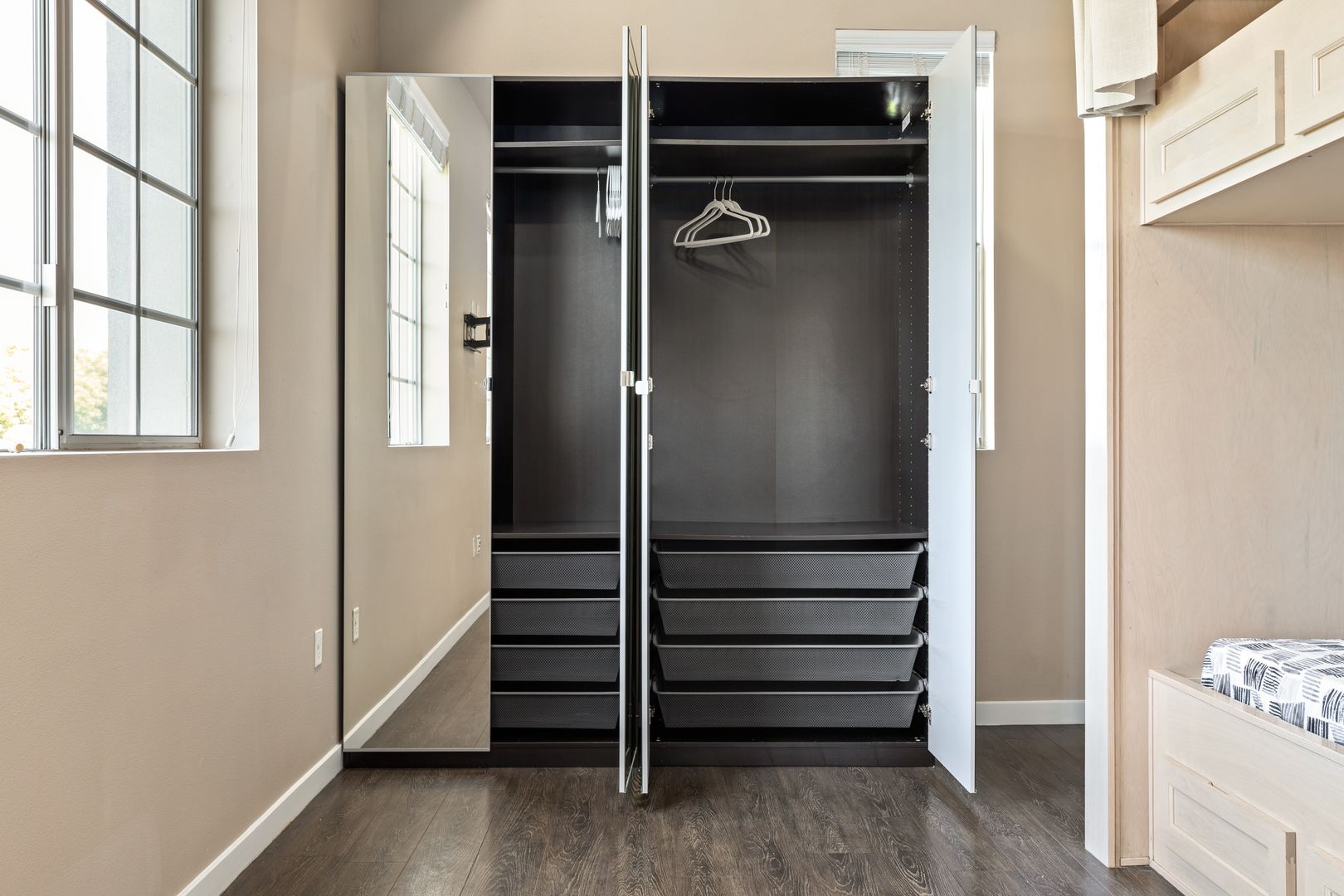 • The interiors boast vaulted ceilings, air conditioning, and in-unit laundry. The living rooms and bedrooms are spacious and furnished with custom-built queen-size beds and lofts, and hardwood flooring.