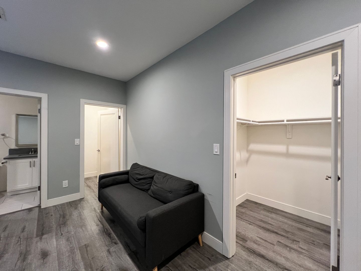 – Living room: couch, coffee table, and TV stand